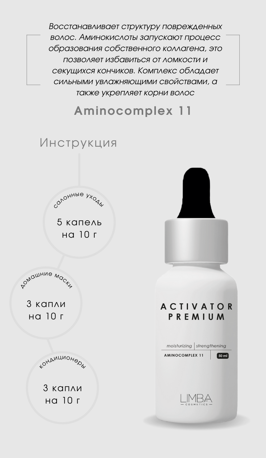 Действие активатора Aminocomplex 11 направлено на восстановление структуры поврежденных волос. Аминокислоты запускают процесс образования собственного коллагена, это позволяет избавиться от ломкости и секущихся кончиков. Комплекс обладает сильными увлажняющими свойствами, наполняя волосы влагой и удерживая ее внутри.