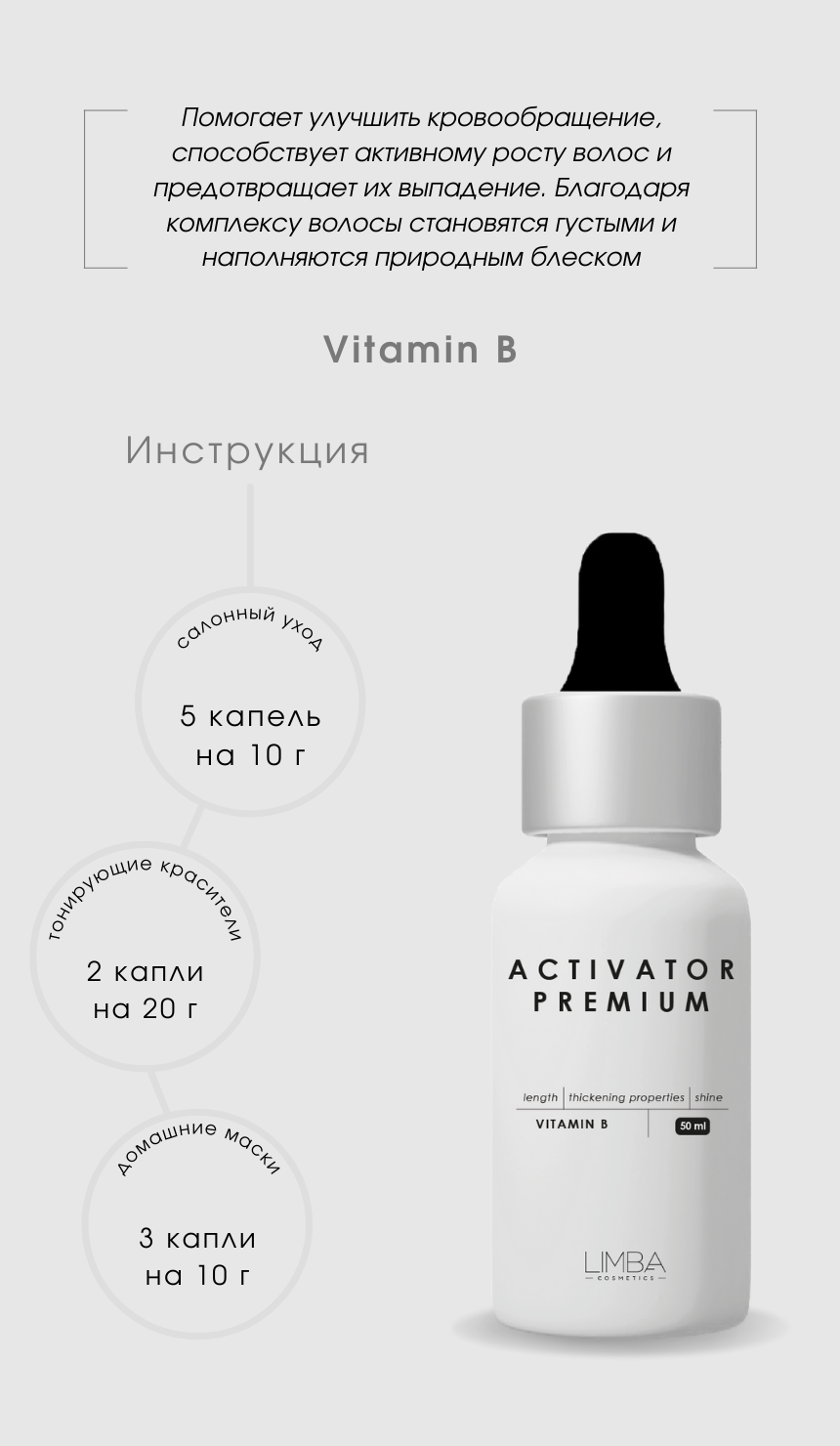 Активатор Vitamin B помогает улучшить кровообращение, способствует активному росту волос и предотвращает их выпадение. Благодаря активатору волосы становятся густыми и наполняются природным блеском. Улучшает состояние кожи головы и увлажняет, создает защитный барьер. Уменьшает появление седых волос. Имеет антиоксидантный эффект.