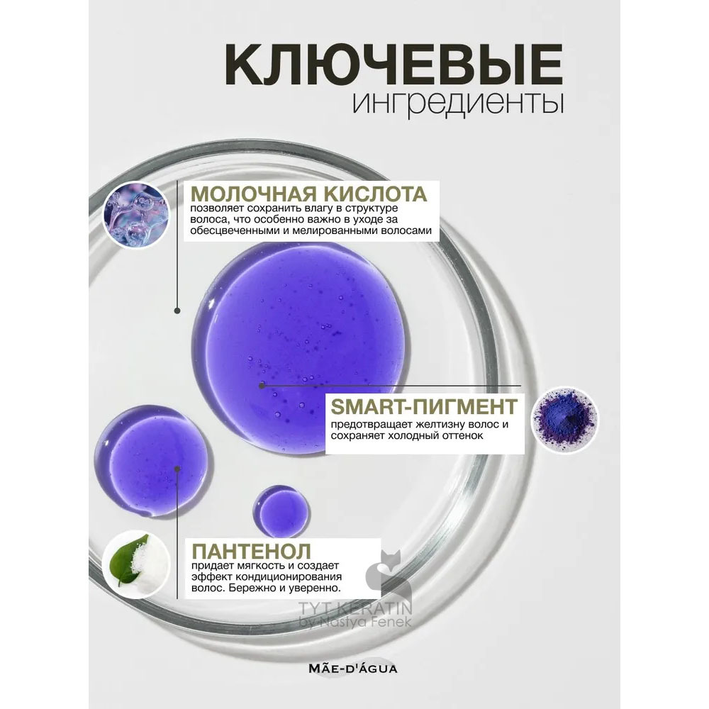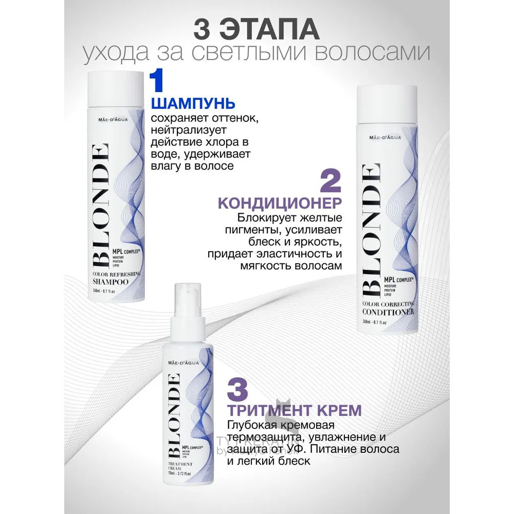 Оттеночный шампунь для волос BLONDE COLOR REFRESHING бренда MAE D'ÀGUA для светлых оттенков придаст сияние и блеск Вашим волосам! Фиолетовый шампунь уберет желтый оттенок с помощью фиолетового пигмента. Шампунь для волос женский прекрасно ухаживает за окрашенными и мелированными волосами с первого дня окрашивания, сделает его ярче и сохранит прозрачность оттенка, обеспечивая холодное восстановление волос. Шампунь для окрашенных волос разработан для ежедневного профессионального ухода и заботы за волосами. Молочная кислота и пантенол в составе шампуня увлажняют волосы, удерживая влагу в структуре на длительное время. Инновационная формула шампуня препятствует и мгновенно компенсирует воздействие хлора во время мытья волос. Уход для волос подходит для регулярного применения благодаря деликатному составу, не пересушивает не забивает цвет волос и не делает их тусклыми. Мягкая формула шампуня делает волосы мягкими и шелковистыми, сохраняет эластичность волоса.